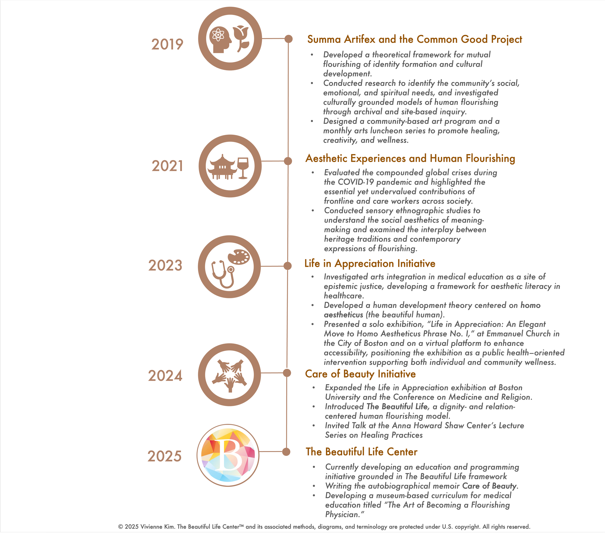 The Beautiful Life Center was founded in 2025 by Vivienne Kim to advance sustainable human flourishing through aesthetic experience. Grounded in interdisciplinary research, the Center develops arts-based initiatives that respond to real-world challenges and enhance the quality of life for individuals and communities.
